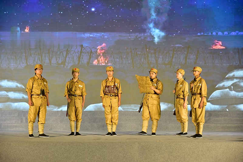 第一篇章“赤心铸华章” 以历史回响与英雄赞歌为主线,带领观众重温峥嵘岁月。深情激昂的朗诵《不朽》,抒发了对革命先辈的无限追思;情景剧《铁血丰碑——董存瑞》以沉浸式的表演,生动再现了英雄视死如归的壮烈瞬间,令人动容;《没有共产党就没有新中国》《打靶归来》等经典旋律再度唱响,铿锵有力的合唱将爱党爱国的赤诚情怀推向高潮;教师独唱《共和国之恋》与歌曲《如愿》,则以深情的歌声,表达了对于伟大祖国和盛世年华的美好祝愿。